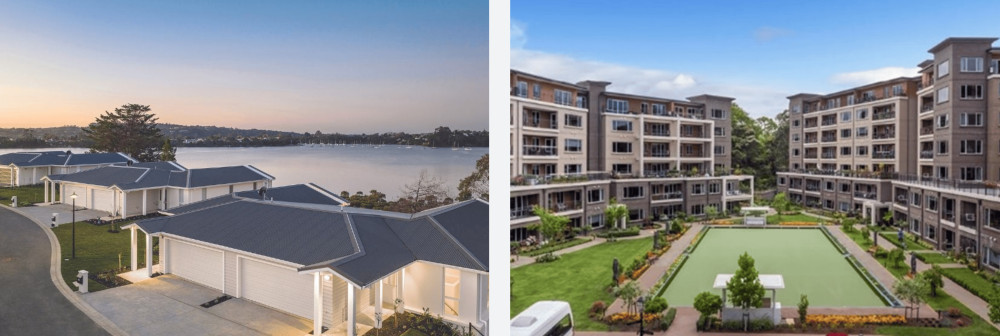 Examples of different developments. Summerset Monterey Park (left) has more villas which are quicker to build and sell as opposed to larger apartment type developments like Ryman Bert Sutcliffe (right). It is important to note that both companies operate a range of different developments, these are merely examples of typical structures.
